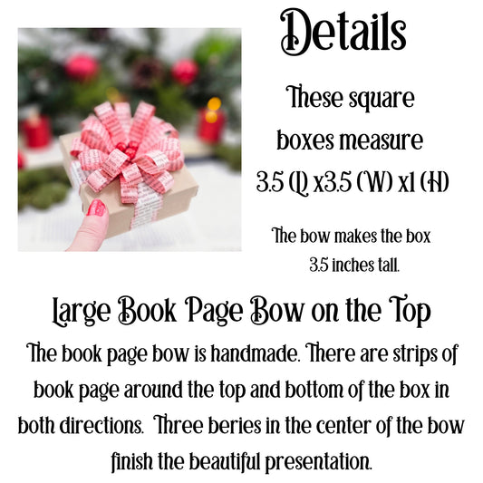 Book themed gift boxes. All of the paper flowers are hand crafted. All gift boxes measure 3.5 inches x 3.5. inches.