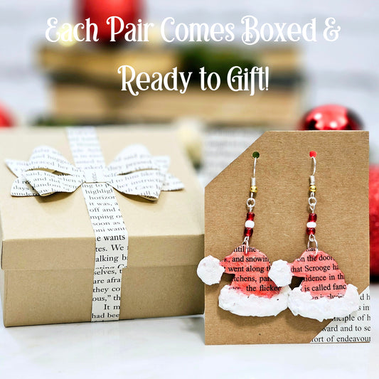 Santa Hat Book Page Earrings for Book Club Gift Exchange and Teacher Gifts
