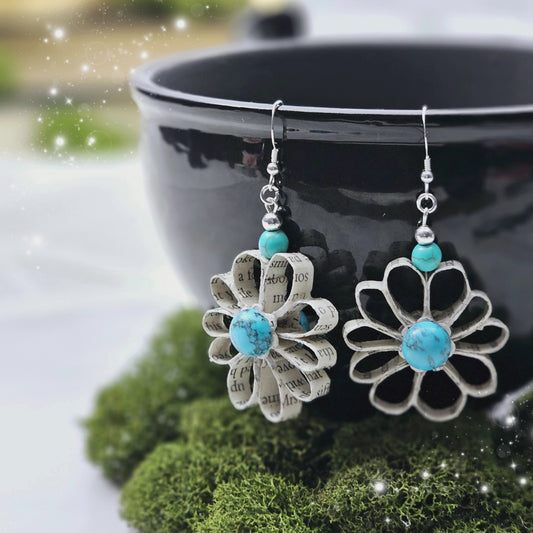 Flower Dangle Book Page Earring with Turquoise Cabachon, Gift for Book Lover