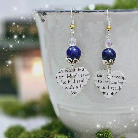 Book Page Tear Drop Dangle Earring with Blue Glass Accent