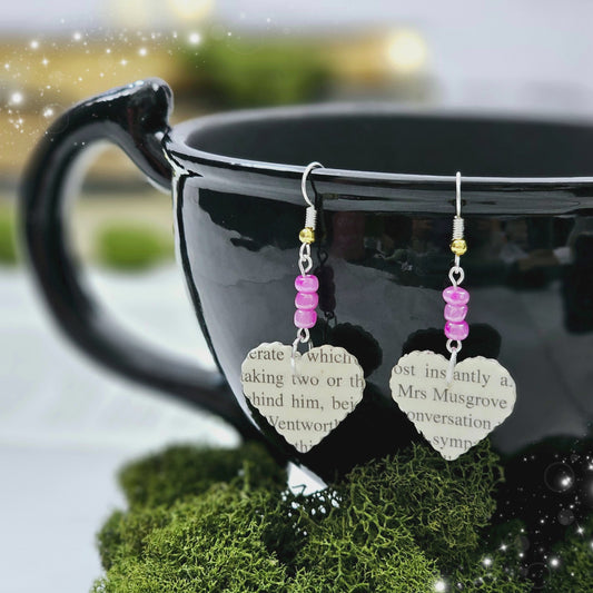 Heart Dangle Book Page Earrings for Book Lover, Teacher, 1st Anniversary or Book Club Gift