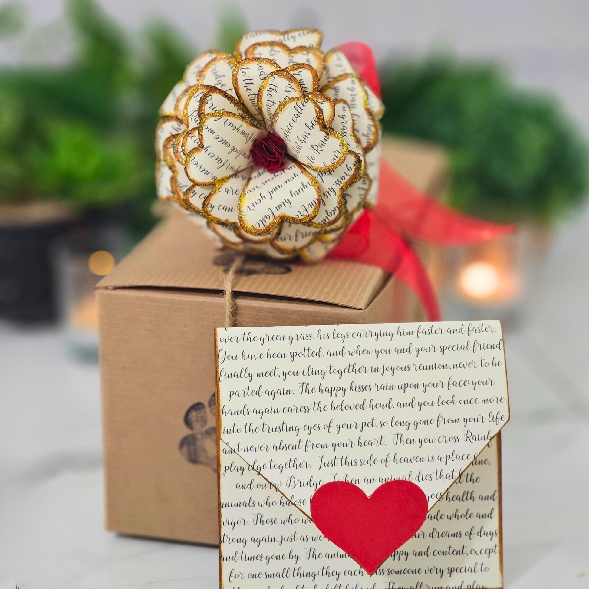 Losing a cherished pet is never easy. This handcrafted Rainbow Bridge Memorial Rose offers a beautiful, lasting tribute to celebrate the unconditional love and joy your dog or cat brought to your life. Each rose is artisan-made with care, featuring the beloved Rainbow Bridge poem printed on premium, acid-free paper that preserves its beauty for years to come.