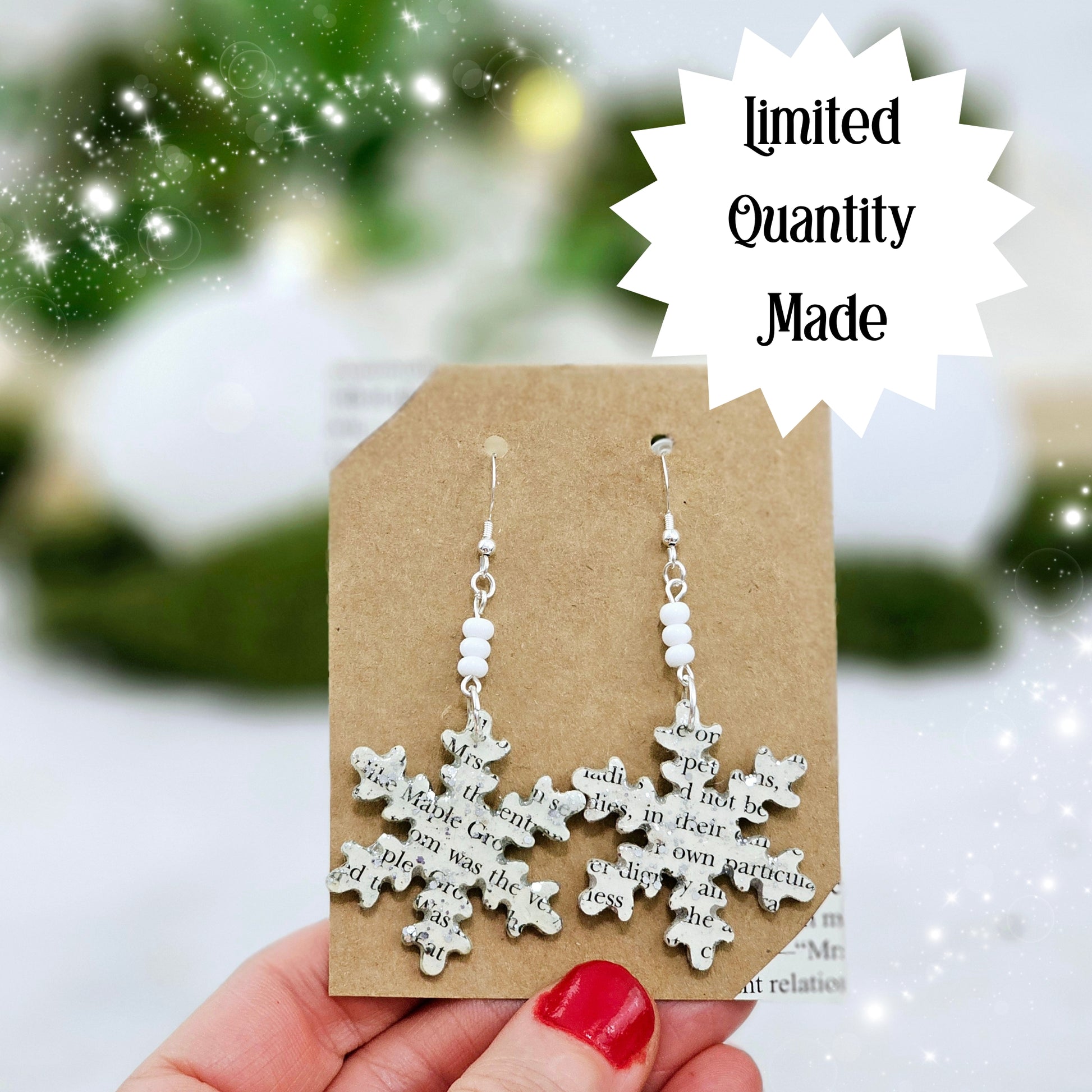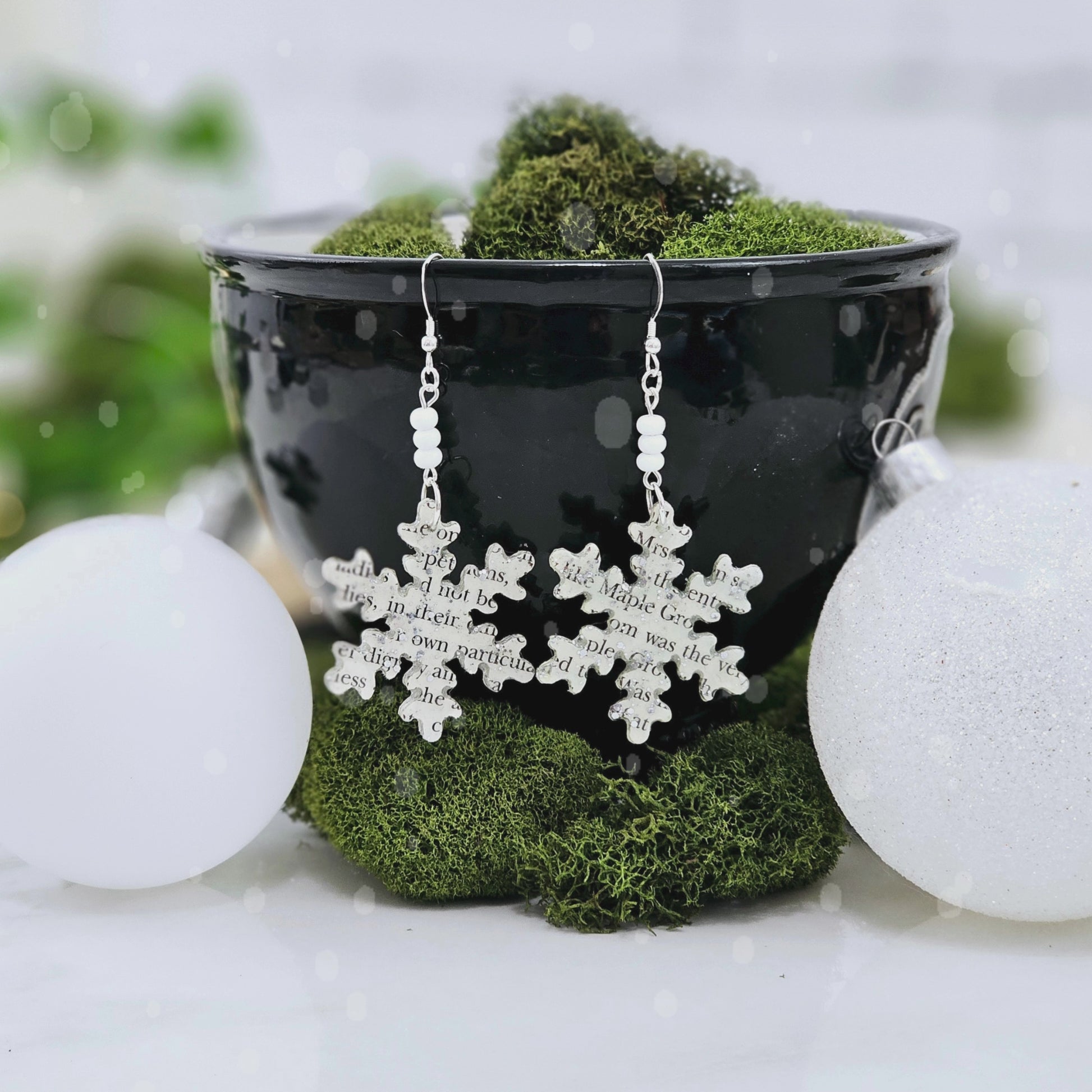 Snowflake Dangle Earrings made from upcycled book pages. Crafted into a timeless piece for any book lovers jewelry collection. My snowflake book earrings is a perfect gift for any book lover, a favorite teacher, book club gift exchange or a 1st anniversary present.